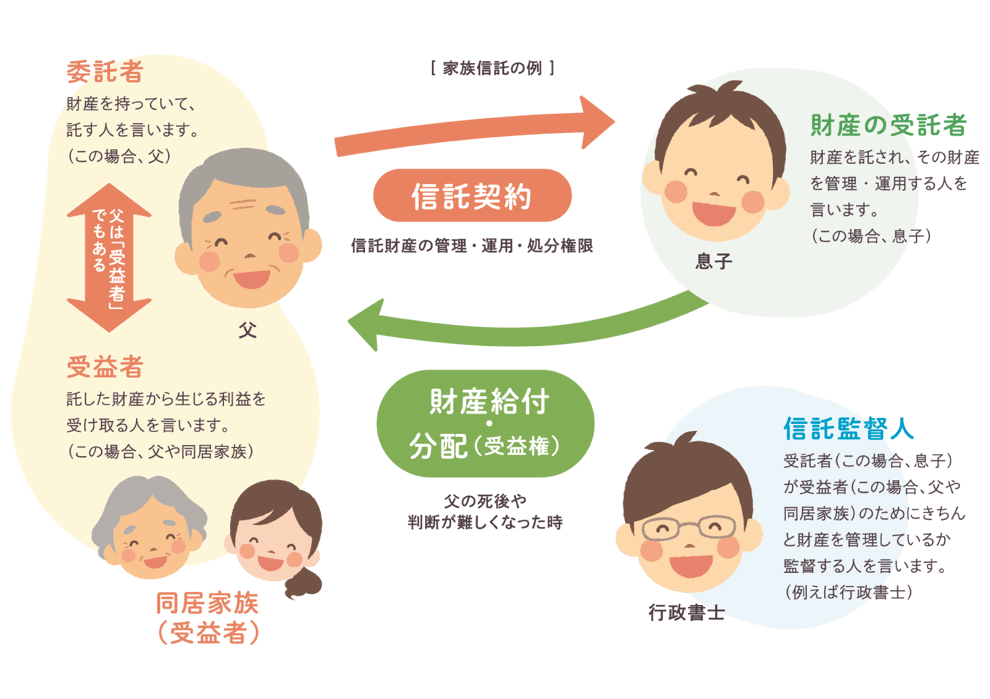 家族信託とは、財産を持っている人(例えば父)が、突然の不幸や認知症等の病気によって判断ができなくなる前に、信頼できる家族(例えば息子)に財産を託し、その財産を管理・運用してもらう仕組みのことを言います。
